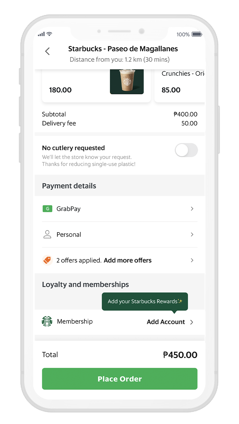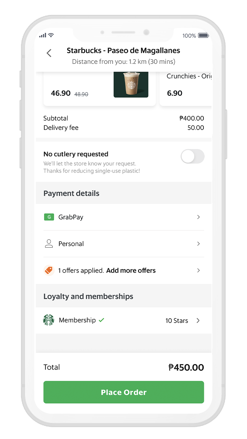 As a Starbucks Rewards member, you'll collect 1 Star for every ₱40 spent on Starbucks orders on GrabFood— no matter how you pay. Every 100 Stars add up to a free drink, pastry or a slice of cake from any of our stores.